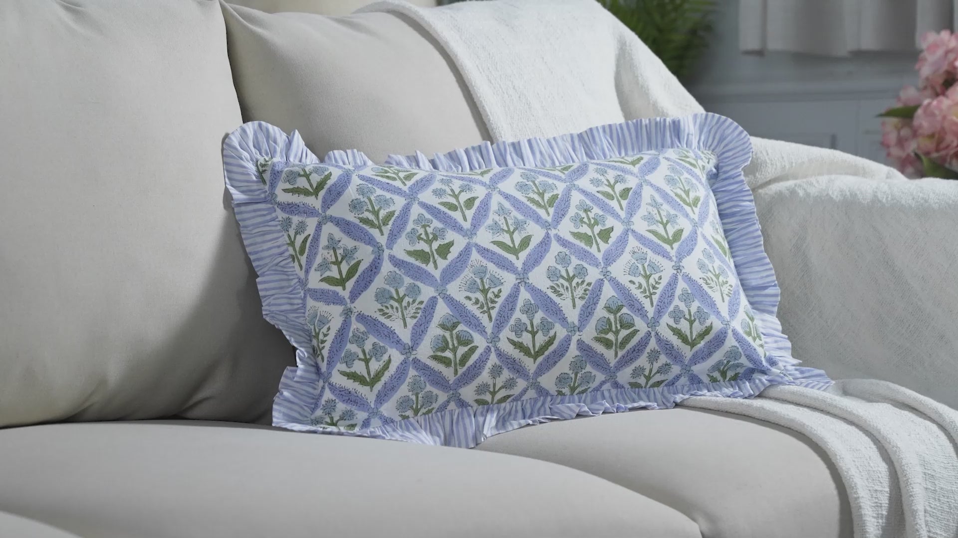 pink floral block print cotton pillow styled on a beige sofa in living room.