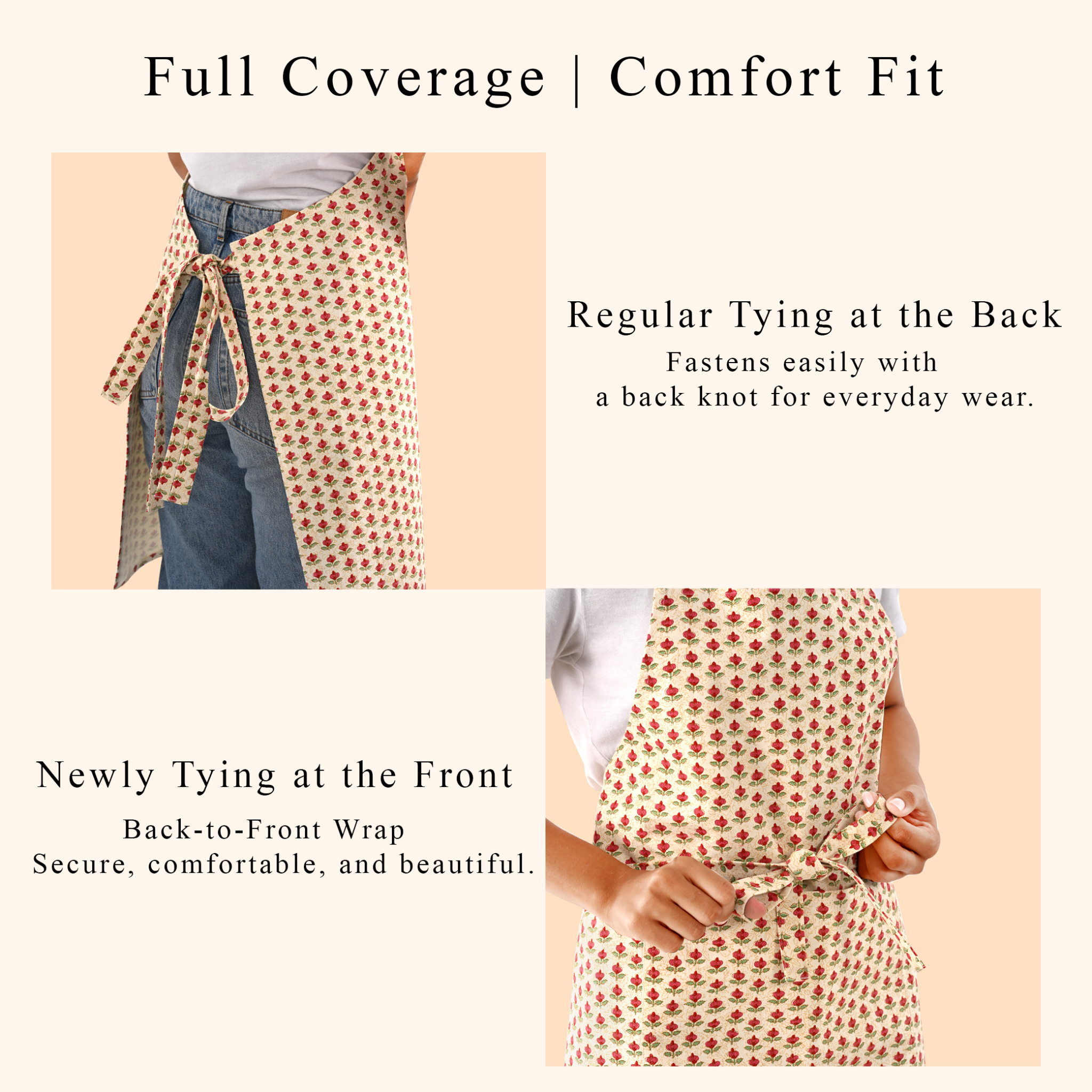 Each kitchen apron is uniquely hand block printed, making it one of a kind. It's full coverage design protects clothes from splashes and spills. A thoughtful gift for foodies, home cooks, and creative souls.